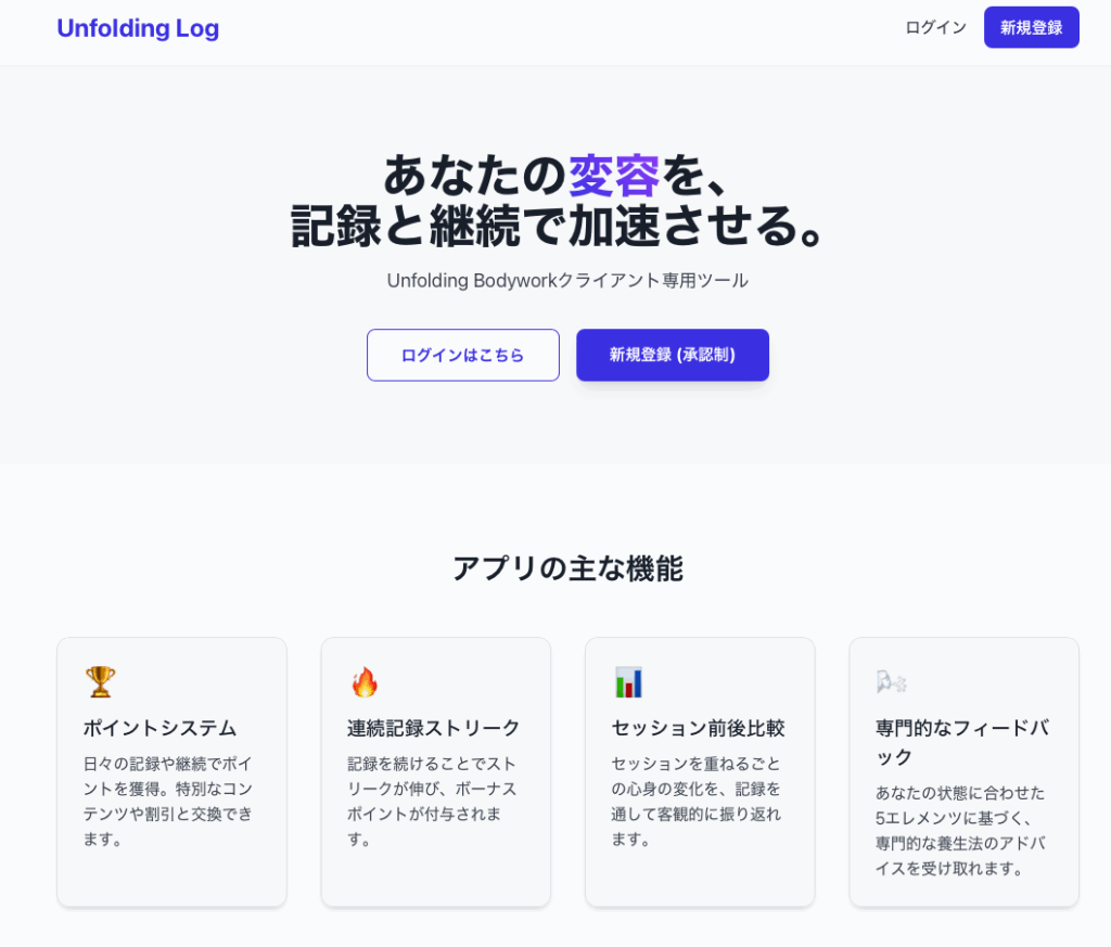 毎日の体調や気分、何気ない気づきを記録していくことで、変容を加速させるwebアプリを開発しました。世界初の「自分と向き合えば向き合うほどポイントがもらえる仕組み」です。ポイントでセッションやワークショップ、講座の割引に使用できます。ただいま、βテスト中につき、ご協力いただけるクライアント様募集中です。詳しくはこちらをご覧ください。